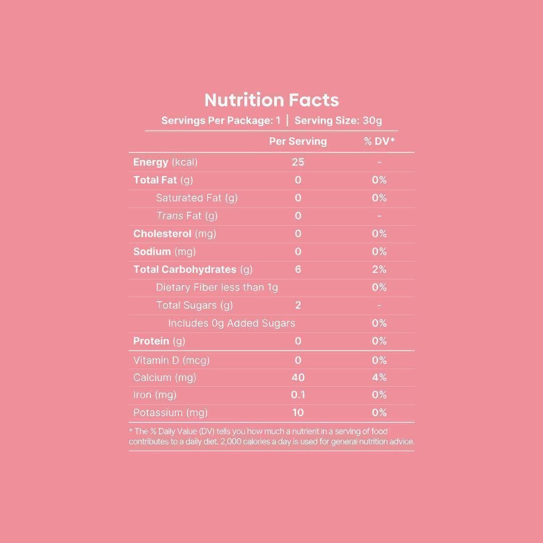 Pure Water, Hydrolyzed Fish Collagen Peptides (PO.OG), Fructose, Apple Concentrate Juice, Gum Arabic, Mixed Berries Concentrate Juice, Black Cherry Concentrate Juice, Vitamin C, Flavouring, Citric Acid, Malic Acid, Bilberry Yeast Extract (25% anthocyanins), Torula Yeast Extract (18% Glutathione), Indigestible Maltodextrin, Xanthan Gum, Sodium Citrate, Sucralose