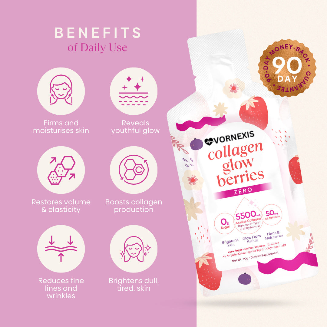 Collagen Glow Berries Zero is crafted to refresh and repair your skin from the inside out, promoting skin hydration, firmness, and barrier protection—all with zero added sugar.