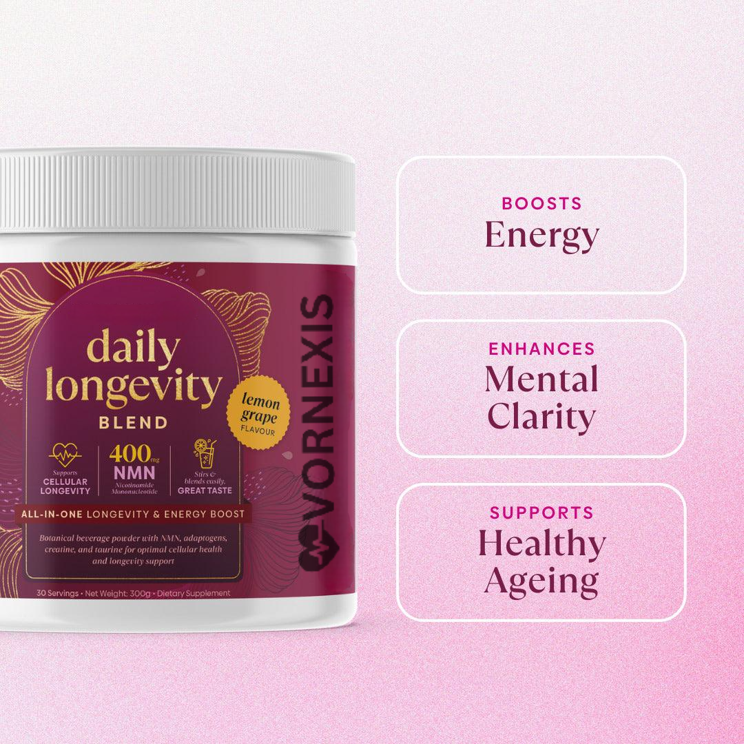 - 400mg NMN (Nicotinamide Mononucleotide) to boost energy and support healthy ageing