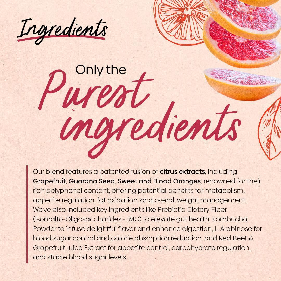 Full Ingredient List: Isomaltooligosaccharide (Imo), Grapefruit Juice Powder, Beet Root Powder, Sinetrol® Xpur C (Grapefruit Extract, Orange Extract, Guarana Extract), L-Arabinose, Konjac Powder, Kombucha Powder, Monk Fruit Extract