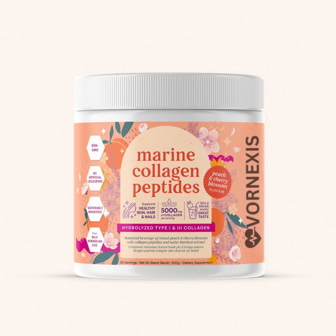 - Marine Collagen Peptides (5000mg) – Hydrolysed for 1.5x faster absorption to hydrate and plump skin.