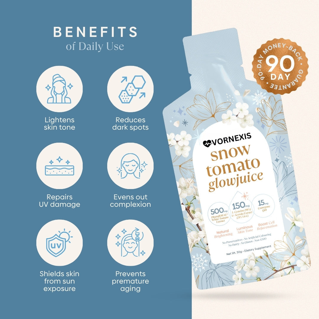 Natural active ingredients in our Snow Tomato Glowjuice have been clinically proven to protect the skin from sun damage, provide significant skin lightening, improve skin evenness, and reduce sun spots.