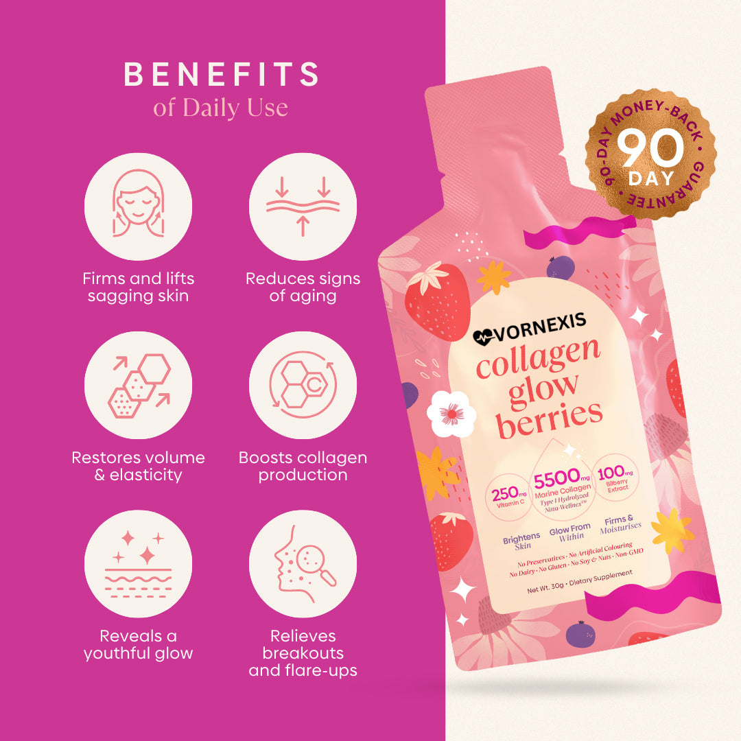 Our Collagen Glow Berries are designed to rejuvenate the skin from within, through skin barrier reparation, skin moisturizing and firming.